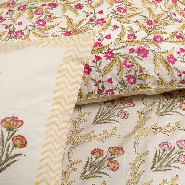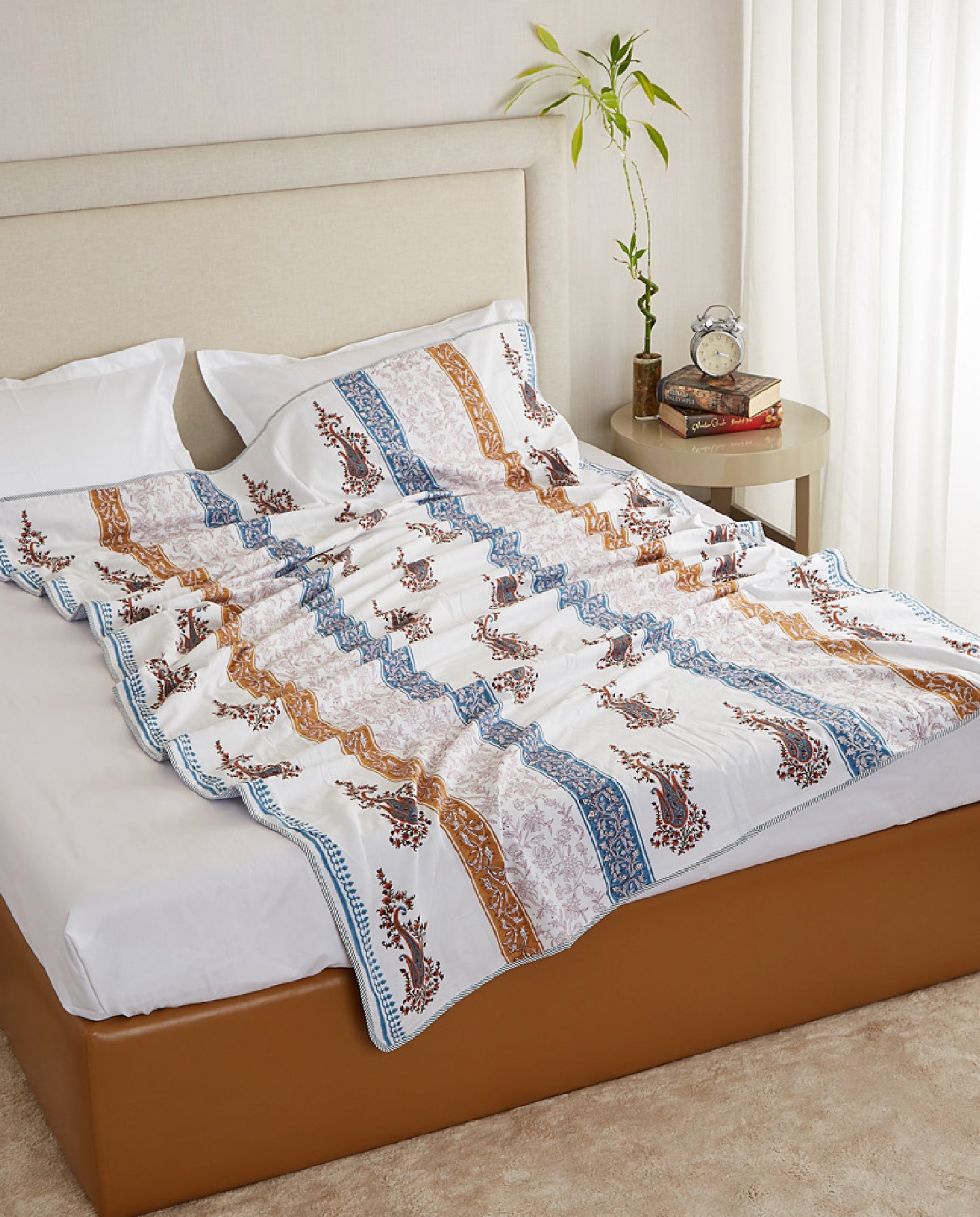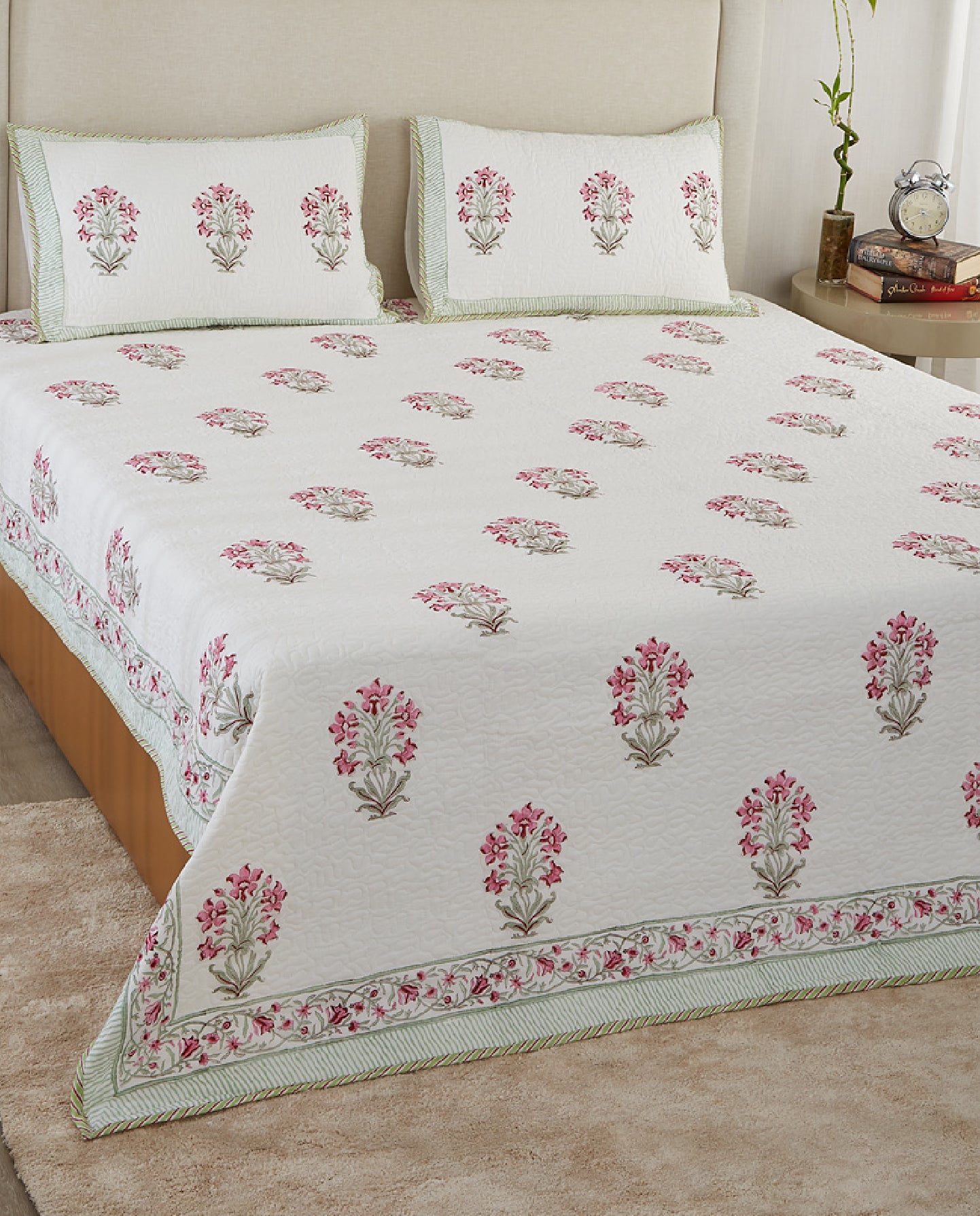 Hand-block printed voile that has been quilted to make a beautiful and soft bed cover. All prints are in traditional Mughal flower bootas and are made by some of the best of Rajasthan’s block printing artists. Detailed and decorative flower bootas with intricated borders and a stylish striped piping at the edges of the bed-cover make this a must have.
